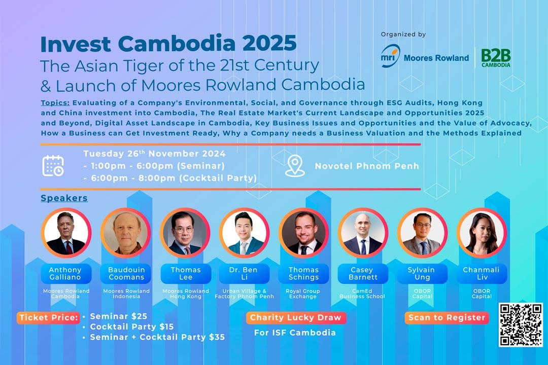 B2B Cambodia and Moores Rowland Cambodia are jointly-hosting ‘Invest Cambodia: The Asian Tiger of the 21st Century’, a half-day seminar dedicated to exploring Cambodia's vibrant investment landscape a...
