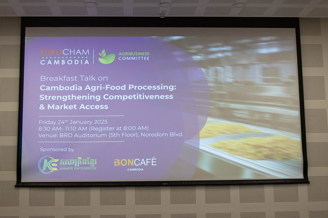 The European Chamber of Commerce (EuroCham) in Cambodia hosted a Breakfast Talk on ‘Cambodia Agri-Food Processing: Strengthening Competitiveness & Market Access’ on January 24, 2025 at the BRD Auditorium, highlighting the challenges and opportunities that exist in the country’s agri-food processing industry, which remains largely underdeveloped.