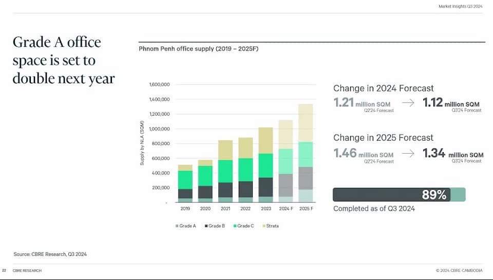 There has been a drop in supply and the forecast was reduced in the office sector in Cambodia with additional supply expected to be 1.12 million sqm in 2024 and 1.34 million sqm in 2025. There have been no new strata offices launched in 2 years in Cambodia.