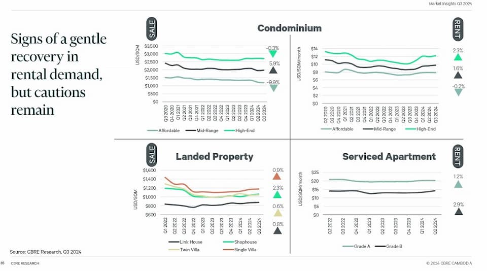 Pricing-wise there has been a drop off in the high-end condos and a small increase in mid-range condos in Phnom Penh, while the rental market has experienced a slight uptick for all categories except the affordable range. Serviced apartment rents are also slightly up in 2024 Y-o-Y.