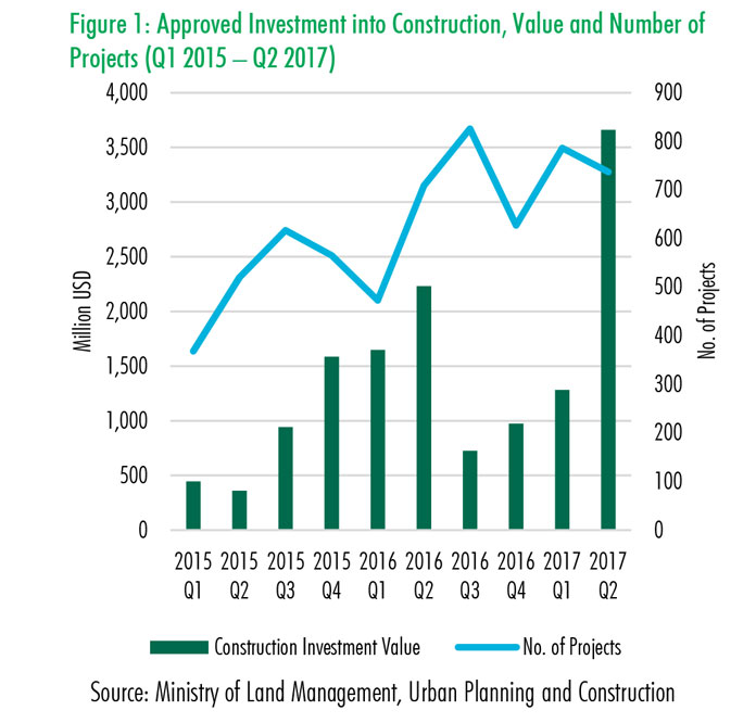 The value of approved investment into the construction sector saw a 64% increase year on year, totalling US$3.66 billion across 737 approved projects nationwide during Q2 2017. Only one condominium project was launched, the development is located on Chhroy Changvar peninsular and comprises 283 units. Sale prices and rents for condominiums were broadly stable in Q2, as they were during Q1 2017. By the close of Q2, overall office occupancy saw a marginal increase of 1.25 percentage points compared to the previous quarter. Average quoting rents for office space fell by 0.5% quarter-on-quarter, while quoting rents for prime retail witnessed a marginal increase over the same period.