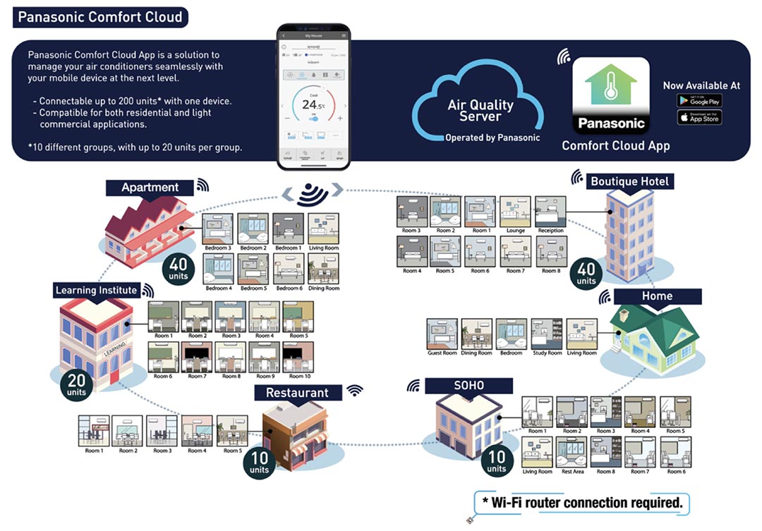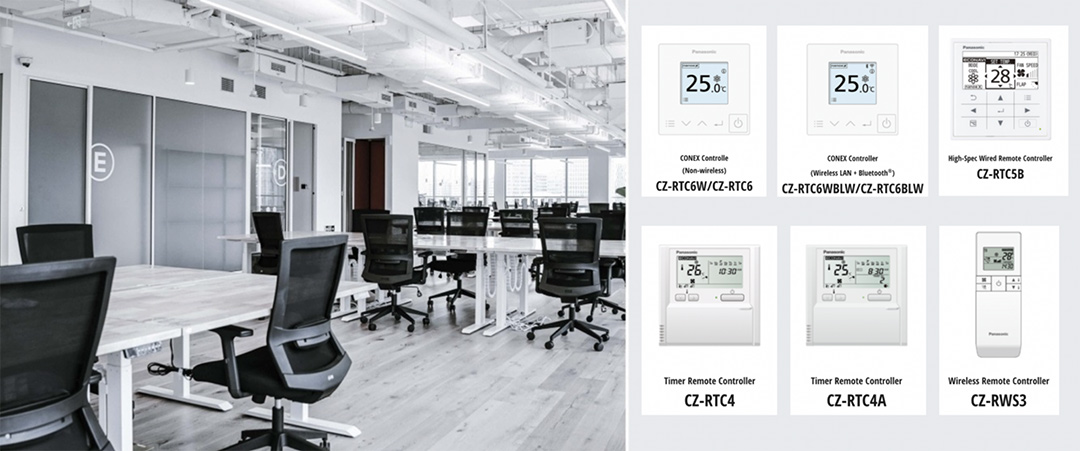 Ideal for commercial or multi-room environments, centralised controllers can operate multiple indoor units. Connecting Panasonic’s CONEX wired remote controller with Bluetooth and Wi-Fi functions also allows end users to to change air conditioning settings, check power consumption, and monitor up to 200 units from one device in real-time.