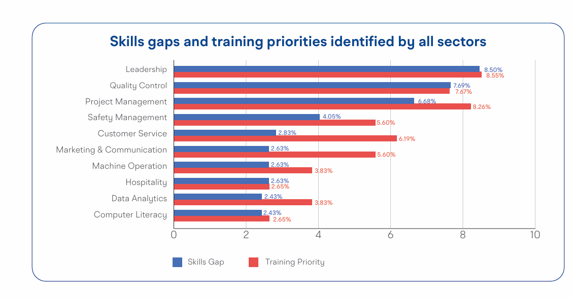 Leadership (8.50 per cent) and quality control (7.69 per cent) were the most prominent skills gap and training priorities cited by all respondents. Analysing the data by each sector individually, leadership, project management and quality control emerged as the most in-demand skills.