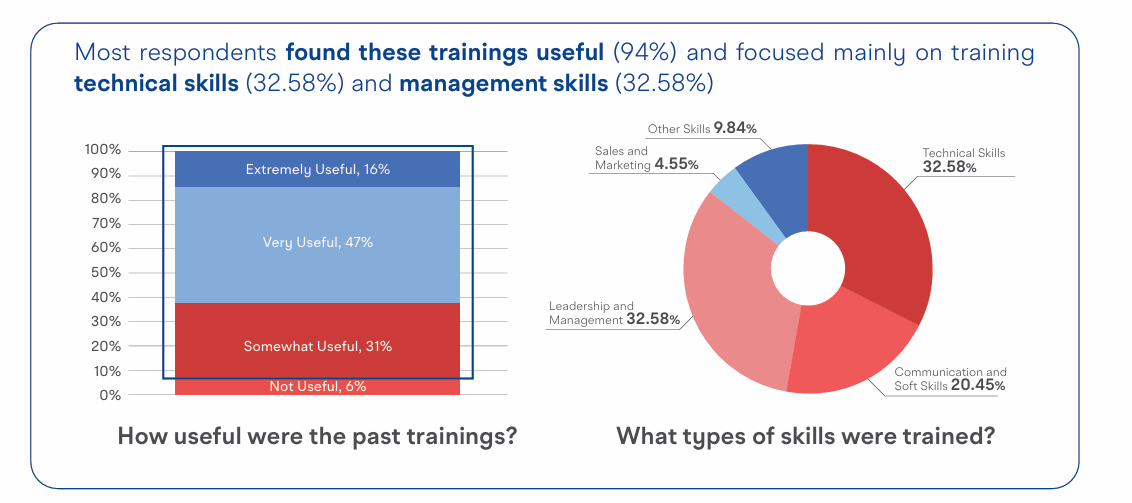 - Respondents who said training courses were useful for their employees covered technical skills (32.58 per cent), management skills (32.58 per cent), and communications & soft skills (20.45 per cent).