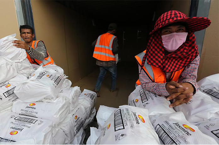 Workers prepare sacks of Cambodian fragrant rice for export. KT/Chor Sokunthea
