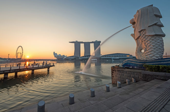 Singapore's iconic Merlion statue sprays water from its mouth into the Marina Bay at sunset. The Southeast Asian city-state has improved its IMD World Competitiveness ranking.