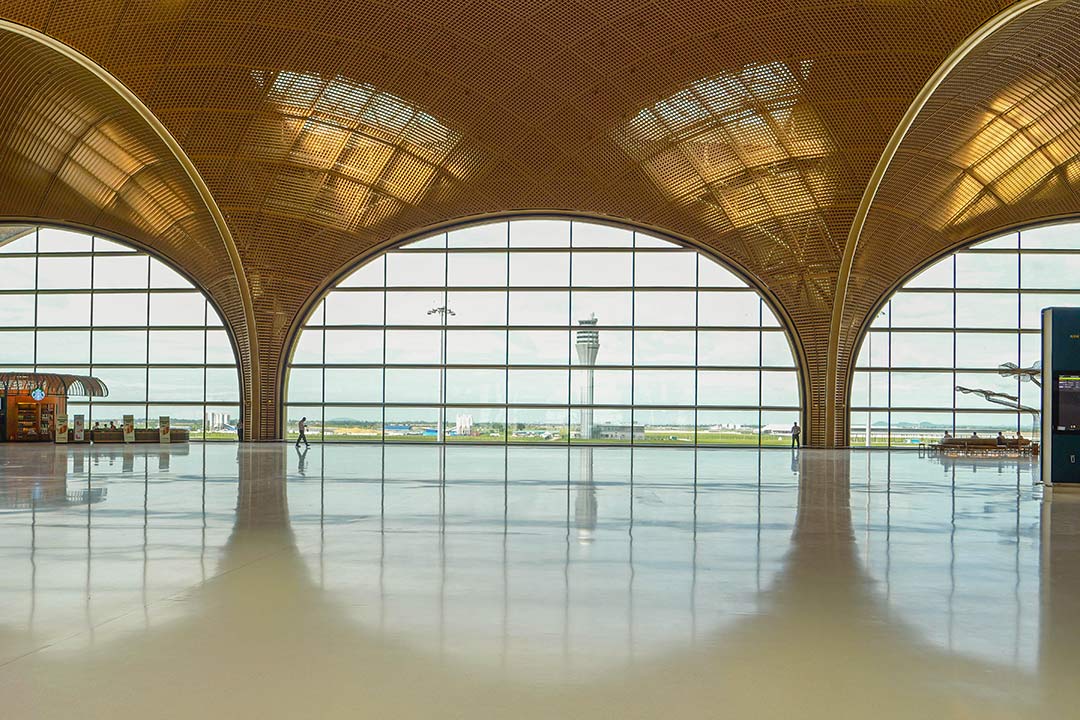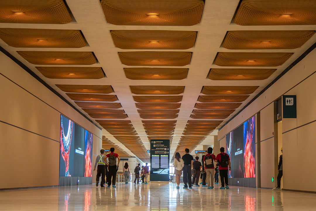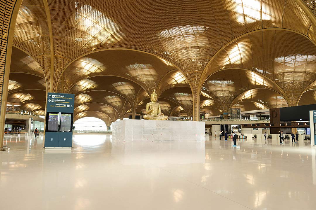 Designed by British international architecture firm Foster + Partners, the airport terminal boasts high ceilings that provide an open and unconstricted experience, with plenty of natural light and greenery, and key design elements inspired by Cambodian culture. The unique lattice design of the ceilings, for instance, draws inspiration from the traditional fabrics and woven baskets of Cambodia heritage handicrafts. The terminal’s symmetrical design and careful consideration of how light enters and moves across the building also takes inspiration from Angkor Wat. At both day and night, the airport is described to appear as a “cathedral of light”, with natural light and cozy lighting making it stand out as a visible monument in Takhmao city.