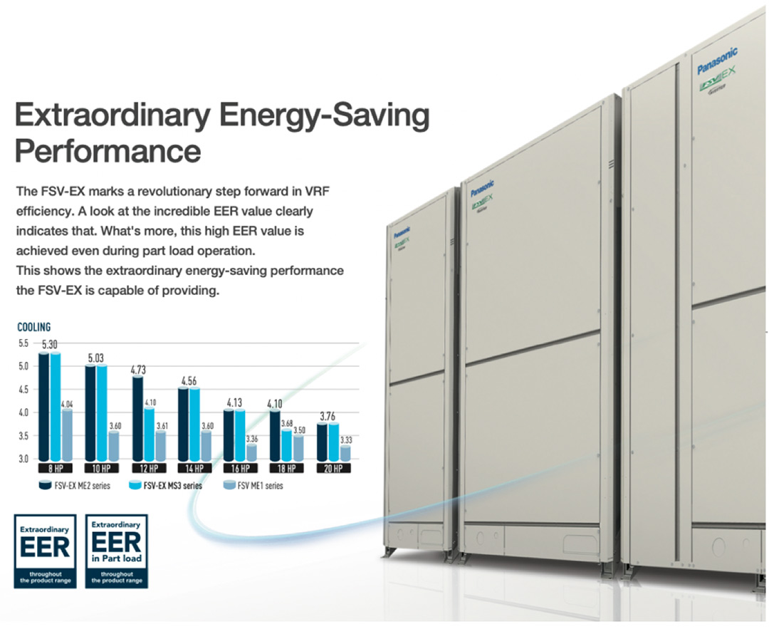 Panasonic VRF/Mini VRF systems utilise high energy efficiency ratio (EER), as well as a DC inverter compressor, and a heat exchanger design, resulting in high energy-saving performance.
