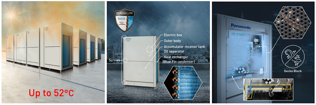 Panasonic VRF systems can withstand temperatures of extreme heat, with cooling operations continuing to be possible even when the outdoor temperature is as high as 52°C.