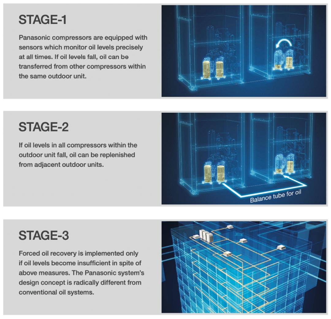 An improved oil management system also minimises the time and frequency of oil recovery by managing it in three stages, equipping units with sensors to detect oil levels, and using accumulators. This reduces energy consumption and maintains comfort without sacrificing cooling capability.