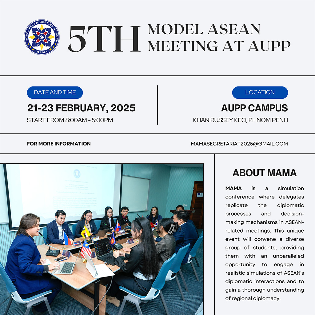 5th Model ASEAN Meeting at AUPP (MAMA) 2025 will be held at AUPP on 21-23 February 2025.