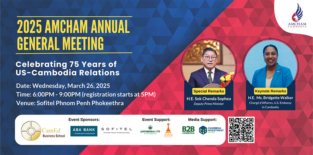 The American Chamber of Commerce (AmCham) in Cambodia is hosting its Annual General Meeting (AGM) & Gala Dinner on March 26, 2025, at Sofitel Phnom Penh Phokeethra, where results for the chamber's 2025 Board of Governors election will be announced.