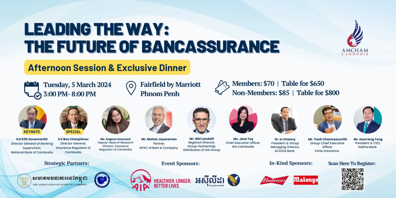 AmCham is hosting the "Leading The Way - The Future Of Bancassurance" event on Tuesday, 5th March 2024 at the Fairfield by Marriott Phnom Penh.