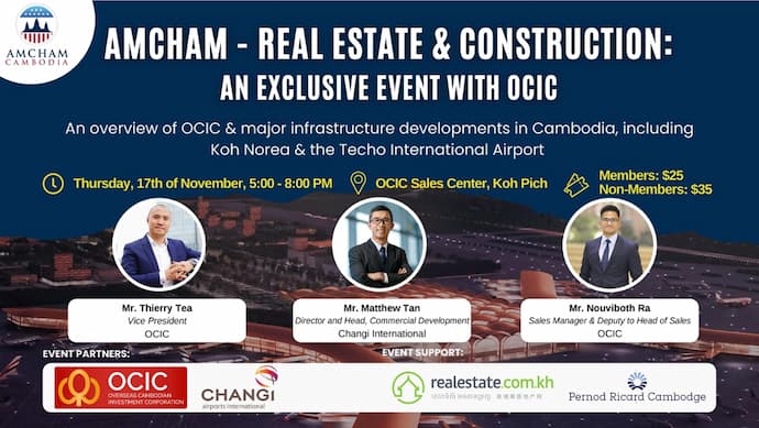 AmCham's Real Estate and Construction Committee are hosting an exclusive event presenting an overview of OCIC and major infrastructure developments in Cambodia, including Koh Norea and the new Techo International Airport in Phnom Penh. The event takes place on Thursday, November 17 2022 with speakers starting at 5:30 PM. There is a networking session following the speeches. Guest Speakers include: