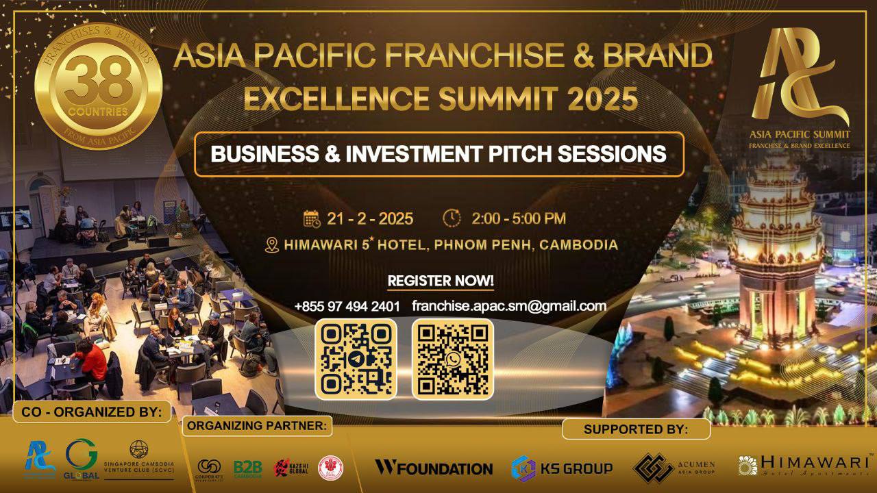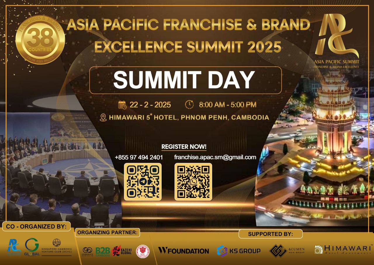 The Asia Pacific Franchise & Brand Excellence Summit (Cambodia) 2025 is being held in Phnom Penh from 21-22 February. There will be a business summit and pitch session held on 21 February, while the main summit day will be held on 22 February at the Himawari Hotel.