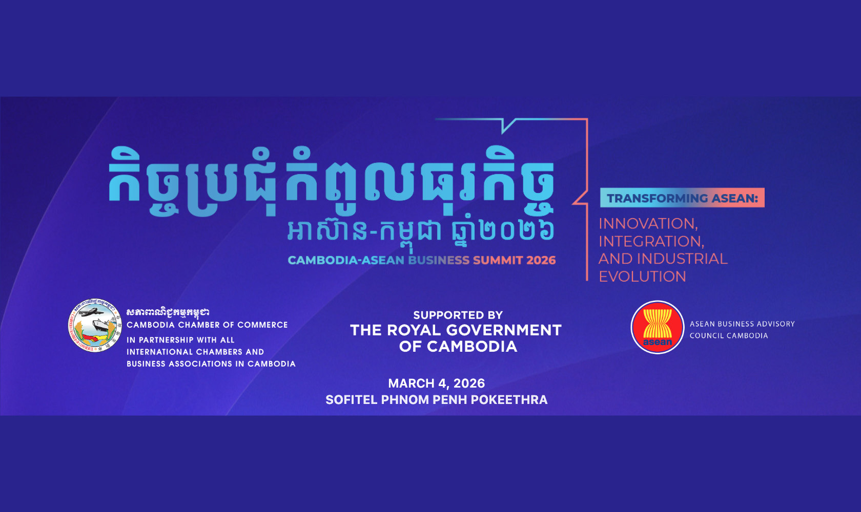 The Cambodia Chamber of Commerce (CCC) and the ASEAN Business Advisory Council (ASEAN-BAC) of Cambodia, in collaboration with other international chambers of commerce and business associations, will host the ASEAN-Cambodia Business Summit 2026 from March 3–4.