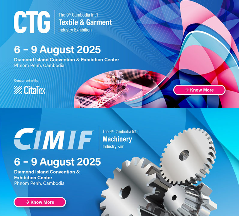 The Cambodia International Textile and Garment Industry Exhibition (CTG) and Cambodia International Machinery Industry Fair (CIMIF) 2025 are to be held from August 6-9 at the Diamond Island Convention & Exhibition Centre, offering a platform to explore new suppliers, cutting-edge machinery, and cross-industry collaboration opportunities.