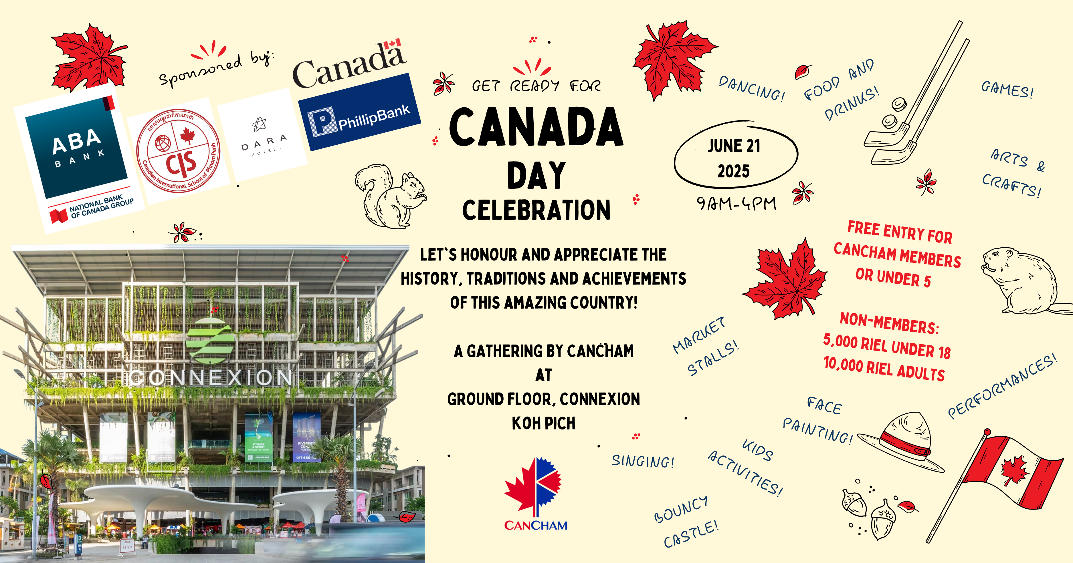 Join CanCham Cambodia on Saturday, 21 June, for its annual Canada Day Celebration Fair—a fun-filled, family-friendly event from 9:00 AM to 4:00 PM at Connexion, Koh Pich (near Trellion Park).