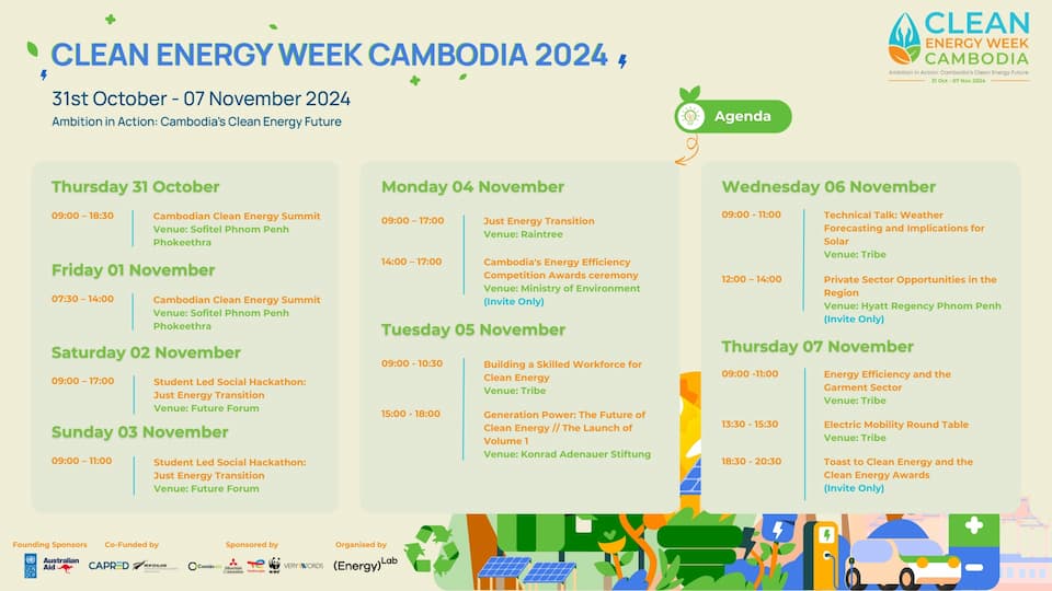 .The Cambodian Clean Energy Week 2024, which is a flagship event showcasing Cambodia's commitment to a sustainable energy future, will be held from 31 October - 7 November 2024 with the Clean Energy Summit held on Thursday, October 31 at the Sofitel Phnom Penh Phokeethra.
