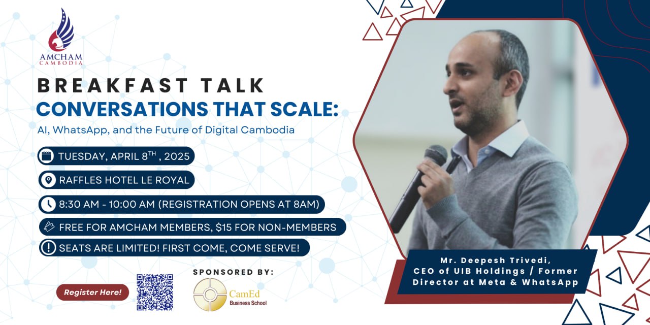 AmCham Cambodia is hosting a breakfast talk on ‘AI, WhatsApp, and the Future of Digital Cambodia’ on April 8, 2025, at the Raffles Hotel Le Royal.