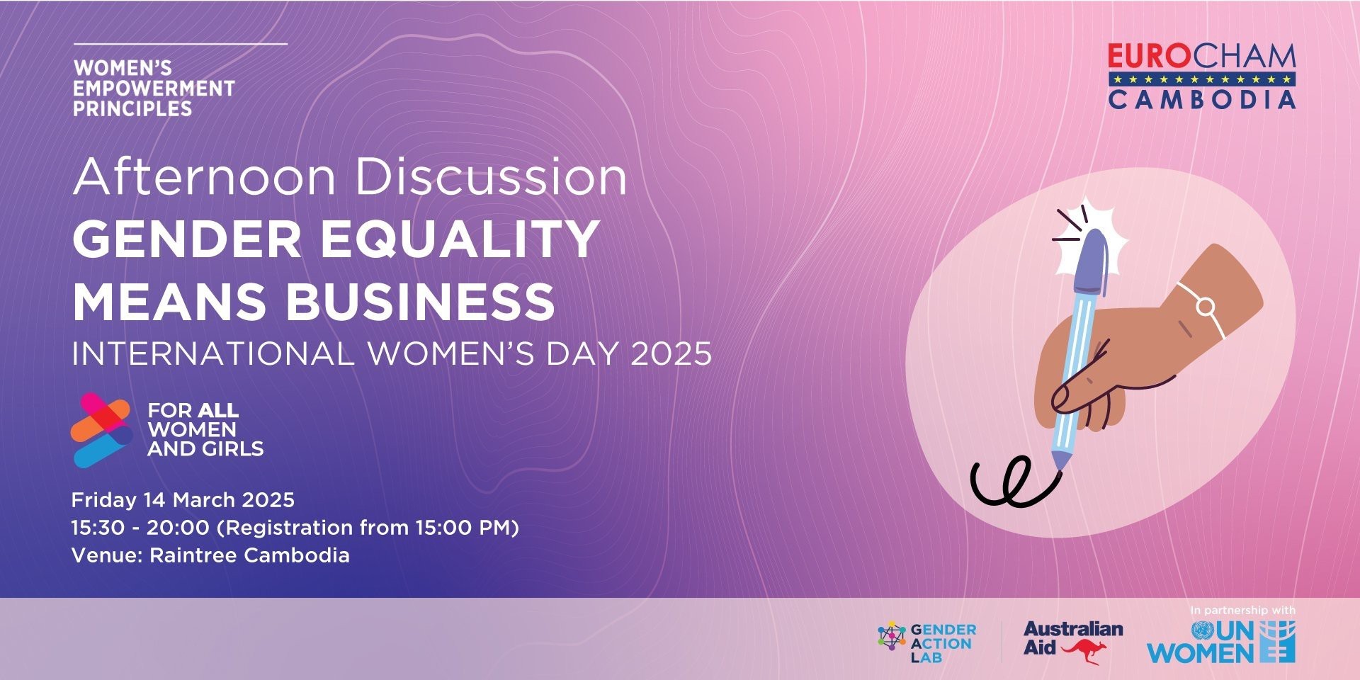 In honour of International Women’s Day, EuroCham Cambodia is hosting a free event, “Gender Equality Means Business”, in collaboration with UN Women. The event will take place on March 14, 2025, at Raintree Cambodia, bringing together leaders and stakeholders from the business community to discuss the importance of gender equality in the workplace.