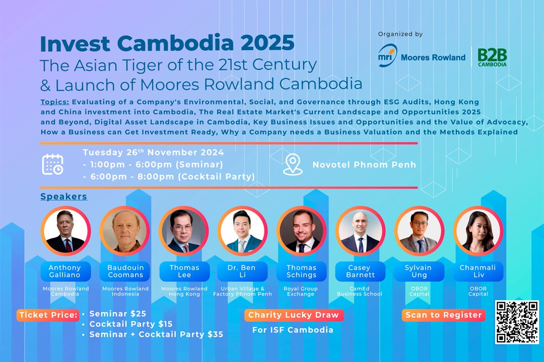 B2B Cambodia and Moores Rowland Cambodia are jointly-hosting ‘Invest Cambodia: The Asian Tiger of the 21st Century’, a half-day seminar dedicated to exploring Cambodia's vibrant investment landscape and its emerging role in Asia’s economy, at the Novotel Phnom Penh on November 26, 2024.