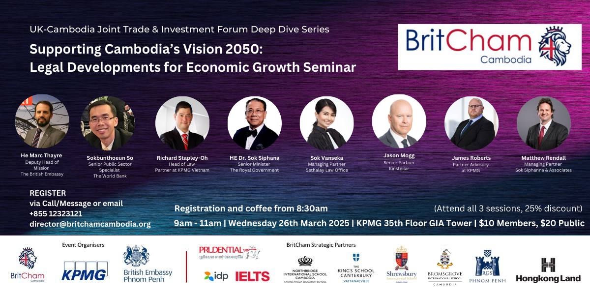 BritCham Cambodia, the British Embassy and KPMG Cambodia are organising a seminar focused on 'Supporting Cambodia's Vision 2050: Legal Developments for Economic Growth' on March 26, 2025, at the KPMG Cambodia office in GIA Tower.