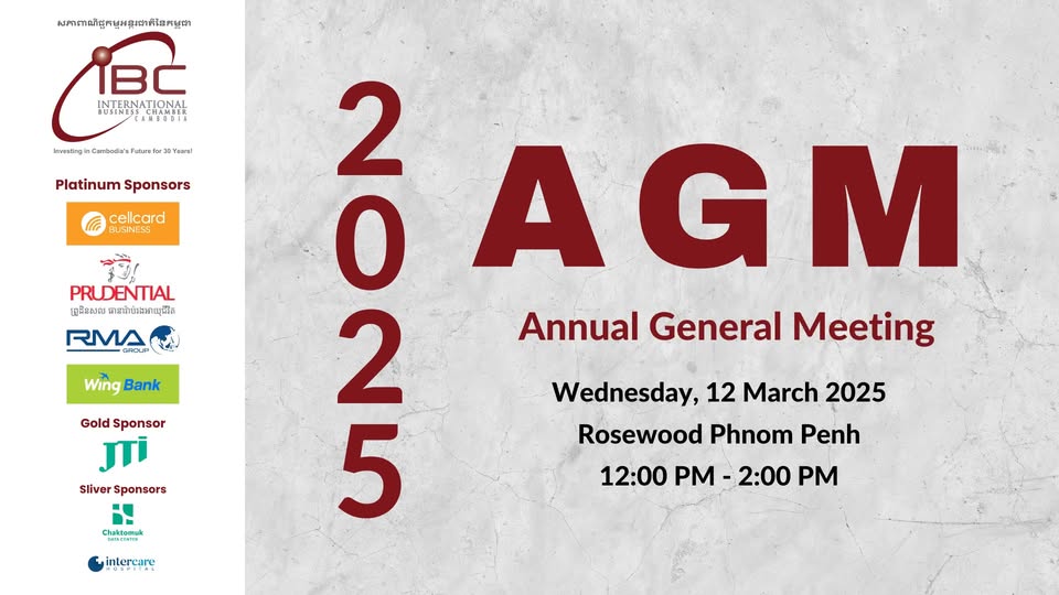 The International Business Chamber of Cambodia (IBC) Annual General Meeting (AGM) will be held at Rosewood Phnom Penh on March 12, 2025.