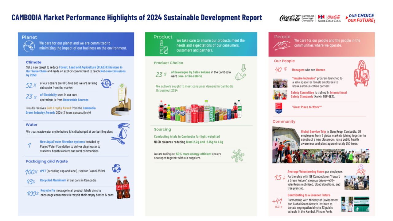 At Cambodia Beverage Company (Coca-Cola), sustainability isn't just a collection of initiatives, it's part of who they are. Sustainability Ownership is a core pillar of its strategy in line with Swire Coca-Cola sustainability principles. The company empowers every team member to contribute meaningfully towards achieving ambitious 2030 sustainability goals. The company believes that every choice and action made shapes the future created—for the planet, people, and communities being served. Coca-Cola's refreshed 2030 Sustainable Development Strategy, “Our Choice, Our Future”, serves as a blueprint at the heart of its business operations.