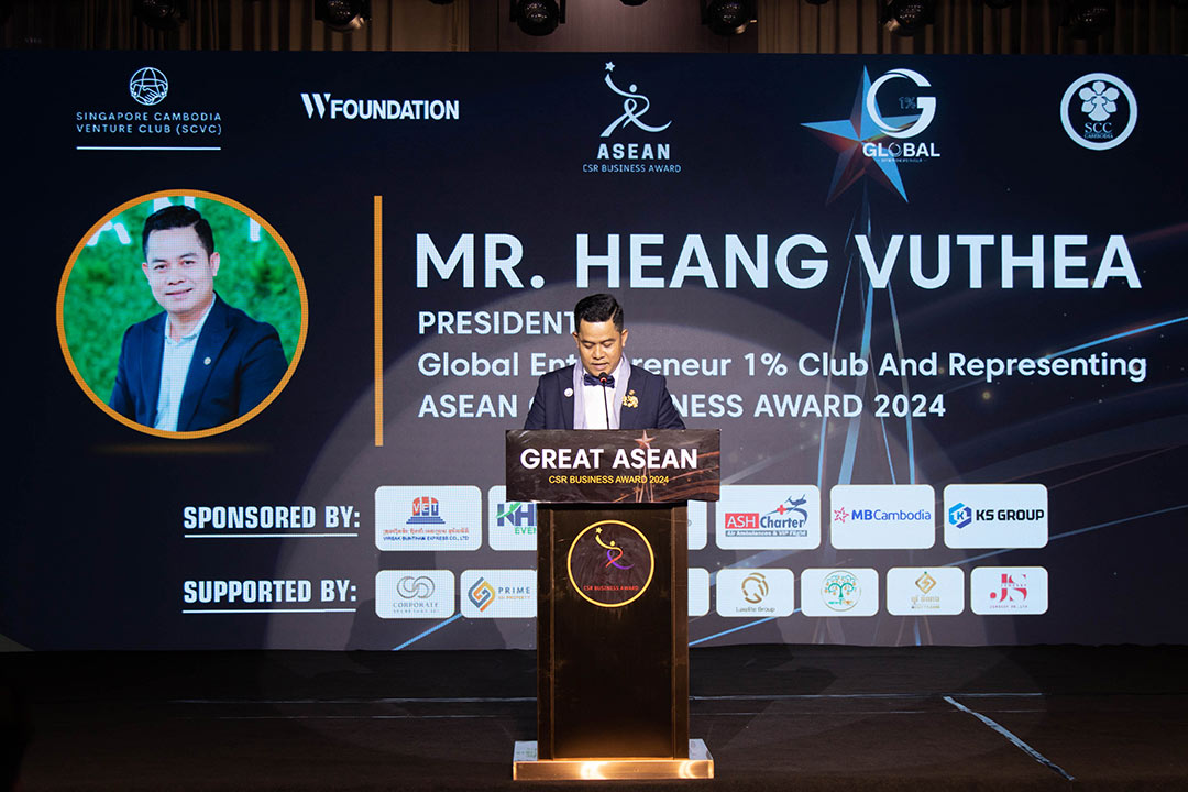 Heang Vuthea, President of the Global Entrepreneur 1% Club, speaking at the Great ASEAN CSR Business Awards 2024./B2B Cambodia