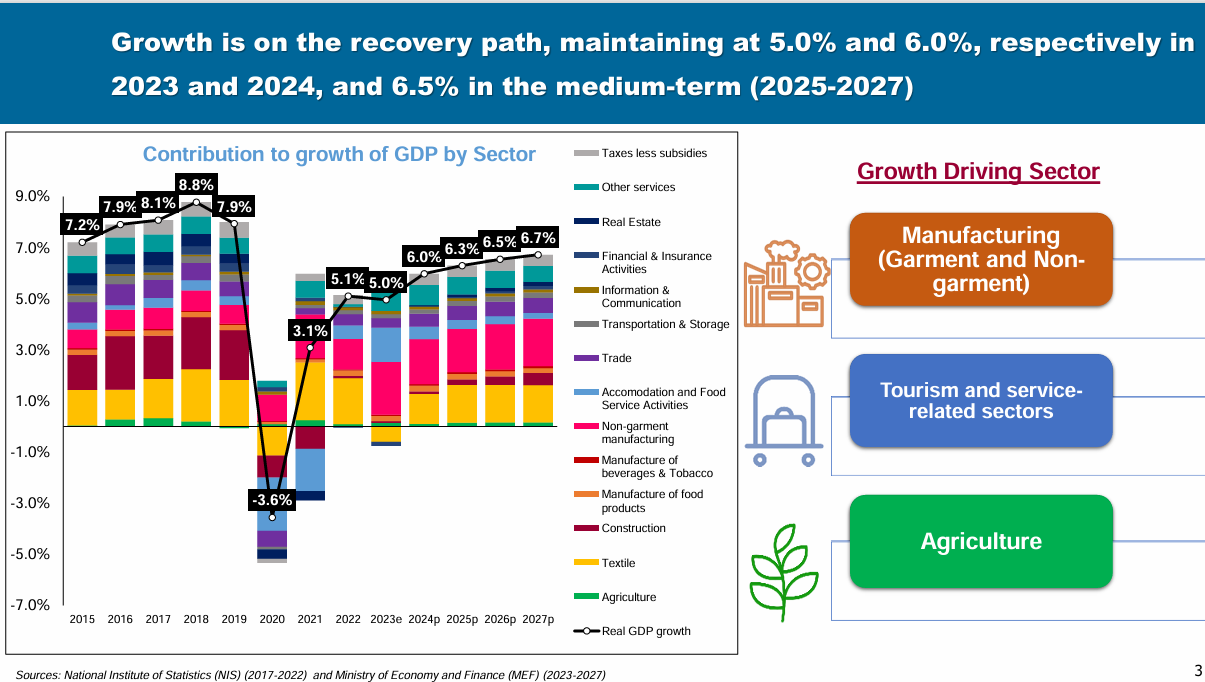 Statistics from the Ministry of Economy and Finance (MEF) highlighted Cambodia's overall economic performance for 2023-2025. In 2025 respectively, Cambodia’s real domestic product growth is projected to grow 6.3 per cent, Gross domestic product (GDP) of USD $51.4 billion, and GDP per capita at USD $2,924.