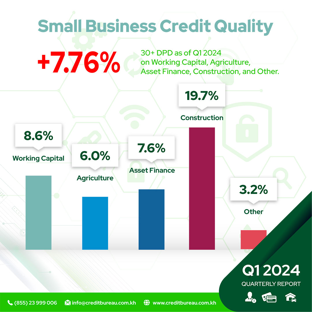 The instance of 30+DPD increased to 7.76 per cent in Q1 of 2024, up from 6.59 per cent recorded in Q4 of 2023. Construction has the highest 30+DPD with a ratio of 19.7 per cent. The largest increase in 30+ DPD was seen in the Coastal region (+11 per cent), followed by the Tonle Sap (+8 per cent) and the Plateau and Plain regions (+7 per cent).