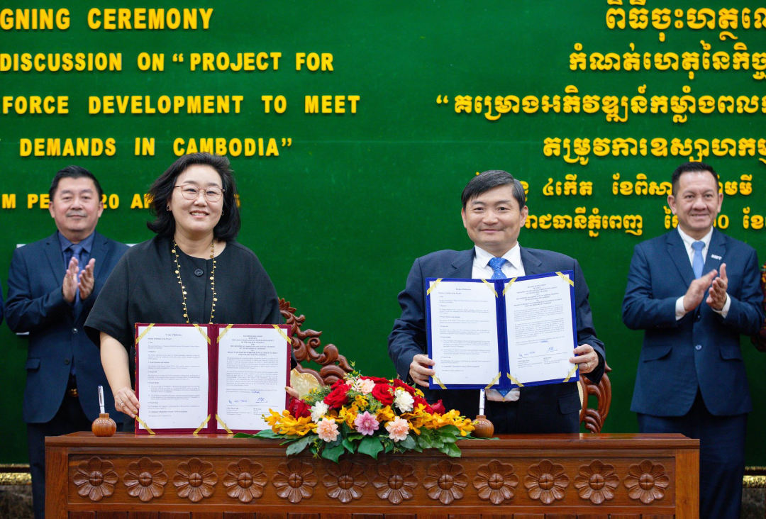 This partnership agreement for the “Project for Skilled Workforce Development to Meet Industry Demands in Cambodia” was signed by H.E. Heng Sour, Minister of Labour and Vocational Training, and Choi Moon Jung, Country Director of the KOICA Cambodia Office, on April 20.