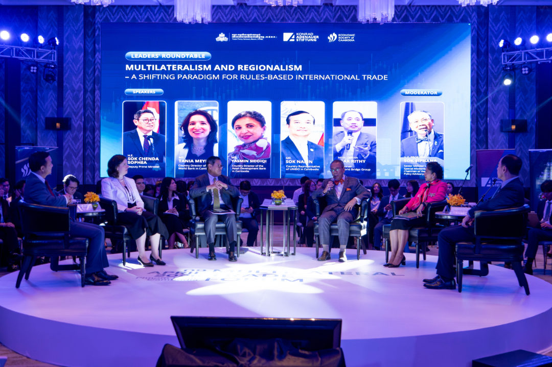 The Forum's programme comprised three substantive sessions. The Leaders' Roundtable on "Multilateralism and Regionalism: A Shifting Paradigm for Rules-Based International Trade", moderated by Senior Minister Dr. Sok, brought together H.E. Sok Chenda Sophea; Tania Meyer, Country Director of the World Bank in Cambodia; Yasmin Siddiqi, Country Director of the Asian Development Bank (ADB) in Cambodia; Sok Narin, Country Representative of the United Nations Industrial Development Organisation (UNIDO) in Cambodia; and Neak Okha Sear Rithy, Chairman of World Bridge Group and Member of TPAB, to discuss Cambodia's Pentagonal Strategy and Vision 2050 path, with LDC graduation posing challenges, including the loss of EU zero-tariff access for garments and other key exports, alongside human capital gaps, high logistics costs, and Thailand's border closure that disrupts bilateral trade.
