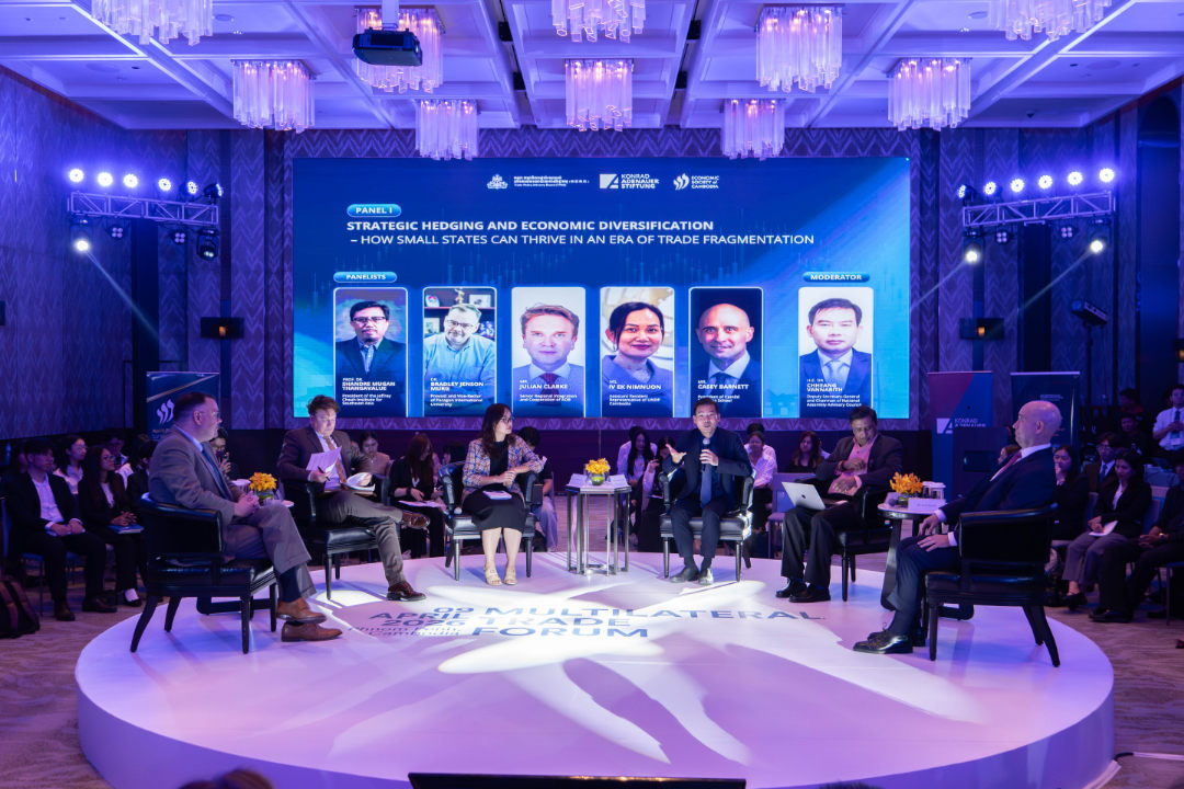 Panel I on "Strategic Hedging and Economic Diversification: How Small States Can Thrive in an Ena of Trade Fragmentation", moderated by H.E. Dr. Chhang Vannarith, Deputy Secretary-General and Chairman of the National Assembly's Advisory Council, featured Dr. Shandre Mugan Thangavelu, President of the Jeffrey Cheah Institute for Southeast Asia; Dr. Bradley Jenson Murg,