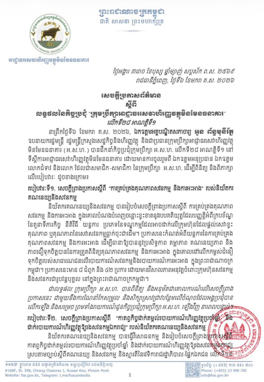 Two of the draft Prakas were proposed by the Accounting and Auditing Regulator (ACAR), while four were proposed by the Trust Regulator, according to a press release issued by the FSA on January 6, 2026.