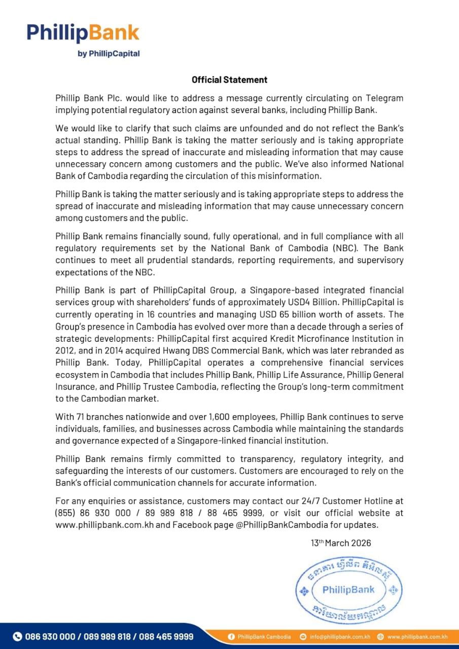 According to the Bank's press release, such claims are false, unfounded, and do not reflect the Bank’s actual standing. Phillip Bank is taking the matter seriously and is taking appropriate steps to address the spread of inaccurate and misleading information that may cause unnecessary concern among customers and the public. Phillip Bank has also informed the National Bank of Cambodia (NBC) regarding the circulation of this misinformation.