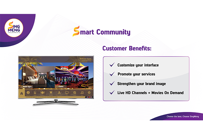 On top of this, subscribers with the full package can also access SingMeng’s Smart Community services. With this feature, the manager of a large hotel or giant residential complex will receive a better, more effective way of communicating with their audience. Our unique and customized TV interface will provide an opportunity for Hotel & Condominium managers to promote their services, coordinate events & strengthen their brand image.