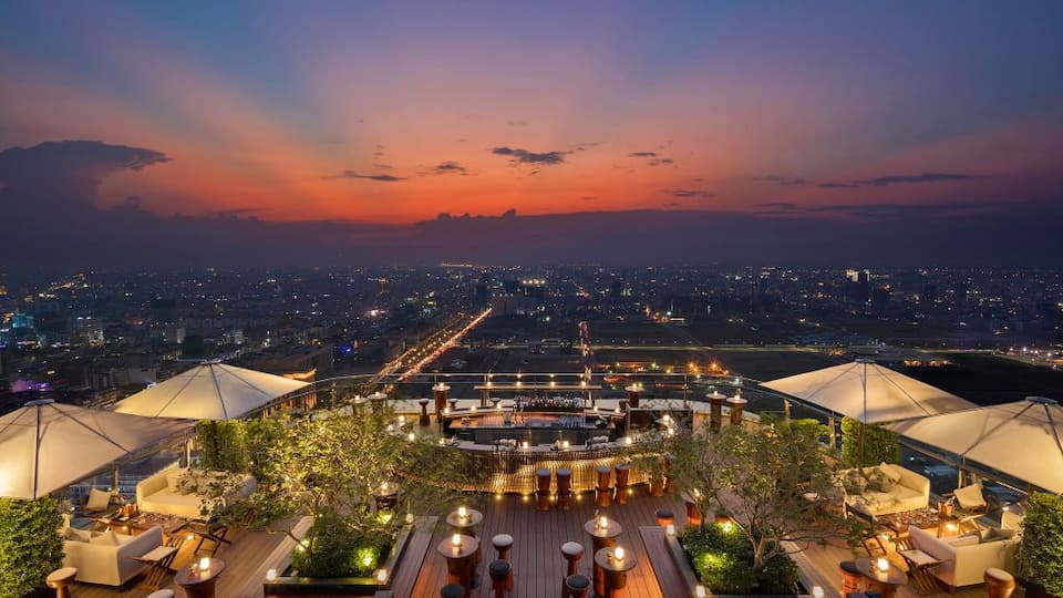 Occupying the top 14 floors of the Vattanac Capital Tower, the luxury Rosewood Phnom Penh offers unparalleled panoramic views of the city skyline and the Mekong River. The hotel’s upscale sky bar, Sora, is a highlight for guests and visitors alike.